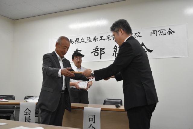 今回の総会にて、同窓会会長として15年間ご尽力いただきました橋口良一様が退任され、川辺支部長の大坪祥浩様が新会長として就任が決まりました。学校と同窓会より橋口様へ感謝の気持ちを込め,感謝状と記念品の贈呈をおこないました。