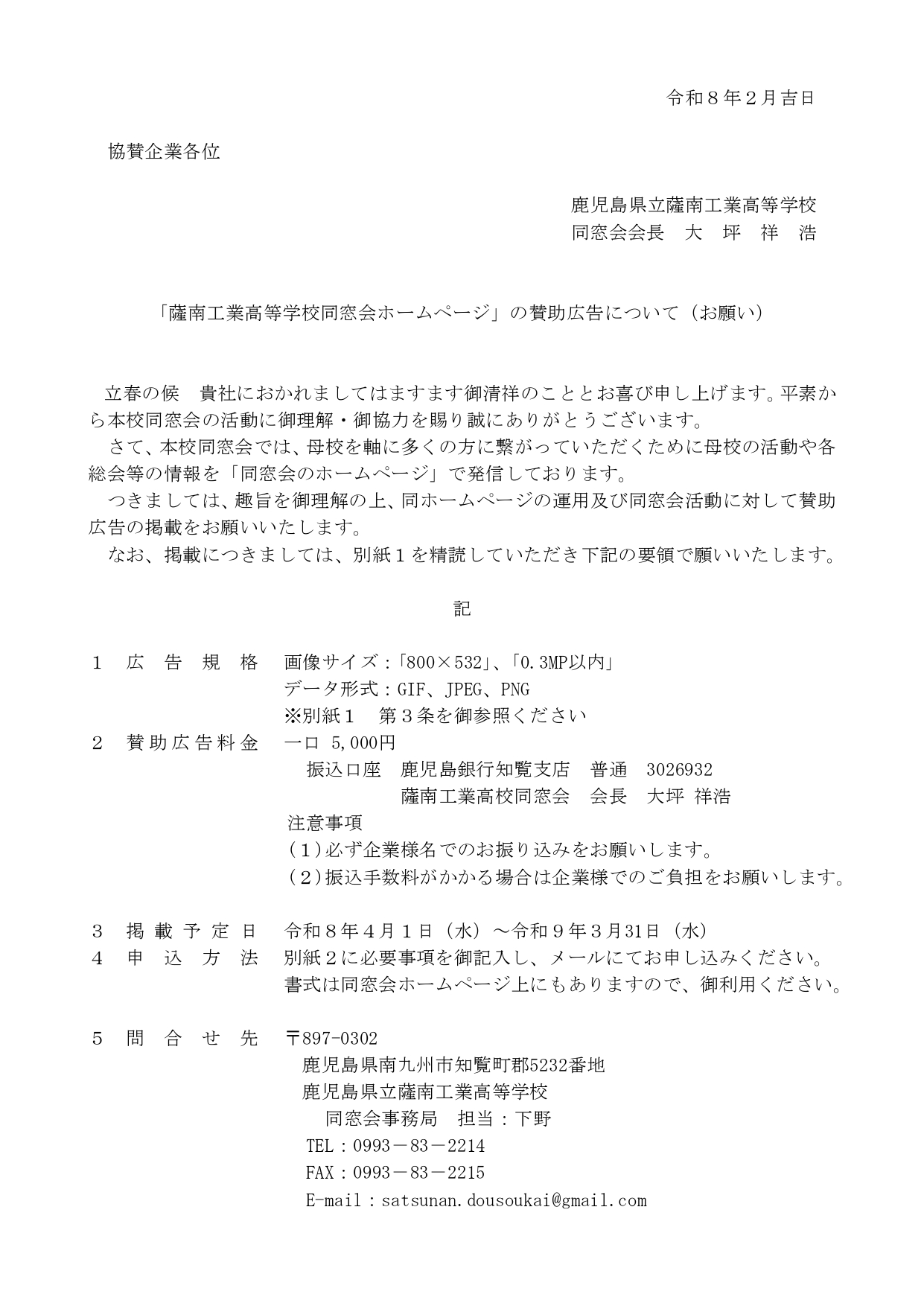 - 同窓会ホームページ賛助広告掲載のお願い。